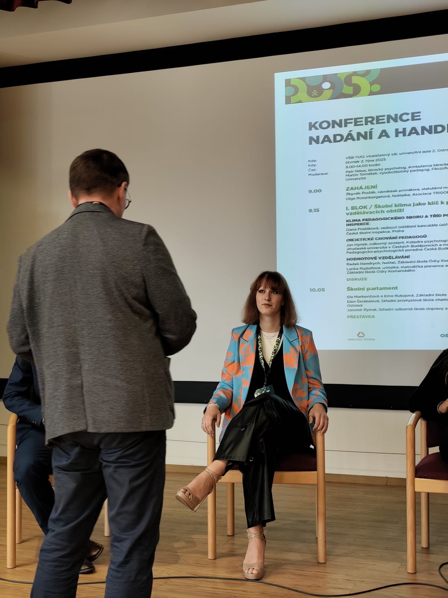 Naše škola měla výrazné zastoupení v části věnované žákovským parlamentům – Elen Škrabalová ze Studentské rady SPŠCH představila, jak u nás funguje zapojení žáků do života školy a jak přispíváme k pozitivní atmosféře i prevenci problémů ve třídách.