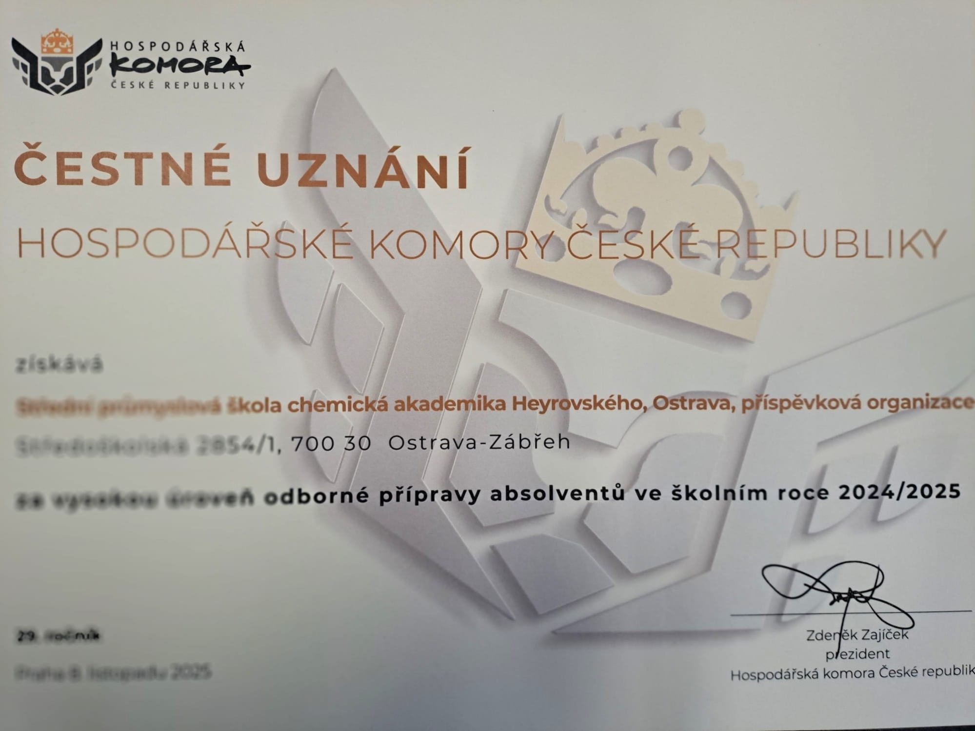 8 loňských maturantů splnilo všechna nelehká kritéria a SPŠCH Ostrava 💚🩵💚 zároveň získala Čestné uznání za vysokou úroveň odborné přípravy absolventů.