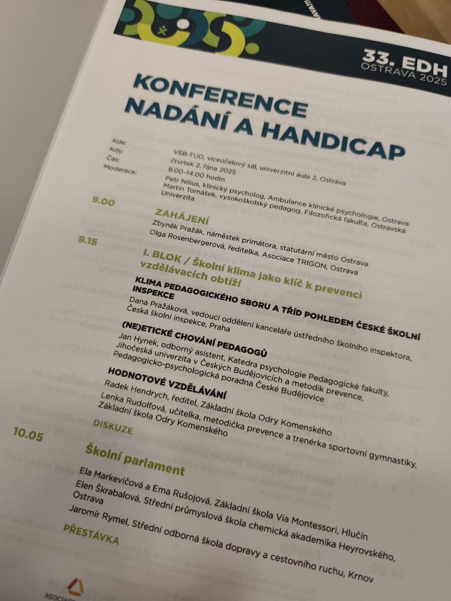 06.10.2025 07:372.10. jsme se aktivně zapojili do konference EDH 2025 – Nadání a handicap, která proběhlana VŠB - Technická univerzita Ostrava . Celodenní setkání odborníků se zaměřilo na školní klima, podporu žáků se speciálními vzdělávacími potřebami a efektivní návrat dětí zpět do školy.